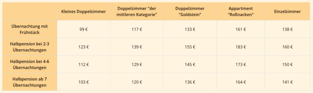 | Übernachtung mit Frühstück | 99 € | 117 € | 133 € | 161 € | 138 € |